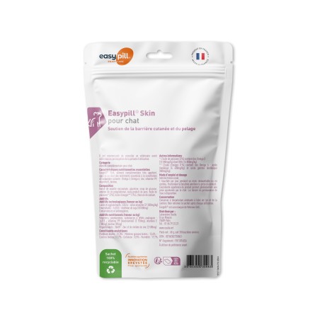 Easypill® Chat Skin est un aliment complémentaire appétent spécialement formulé pour soutenir la santé de la peau et du pelage chez le chat. Grâce à une combinaison unique d’acides gras essentiels, de vitamines et de minéraux, il contribue à renforcer la barrière cutanée, apaiser les démangeaisons et favoriser un poil brillant et soyeux.