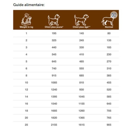 Respecter la ration journalière indiquée par votre vétérinaire, adaptée au poids et à l’état de santé du chien.