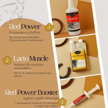 - Conditionnement PETIT : Le pack comprend le Red Power en 1 L, le Lactomuscle en 1L et une seringue de 60 ml Red Power Booster