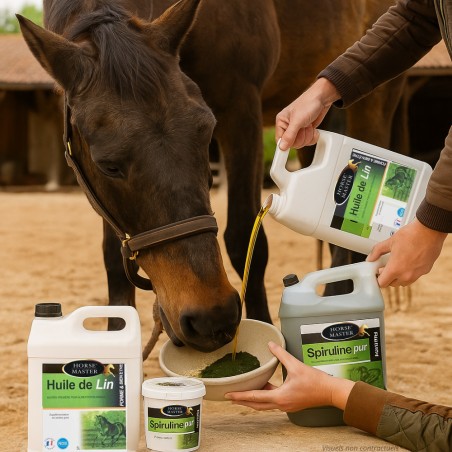 Le pack Perte d’État pour cheval réunit deux indispensables pour soutenir la reprise d’état, l’appétit et la qualité de l’état général chez le cheval âgé ou convalescent : Spiruline 2 kg (source naturelle de protéines, acides aminés, vitamines et antioxydants) et Huile de lin 5 L (riche en oméga 3-6-9) pour une énergie progressive, un brillant de la robe et un apport calorique digeste sans échauffement. Ce bundle a été conçu comme un protocole simple et efficace pour aider le cheval qui fond, manque d’appétit ou a des difficultés à reprendre.