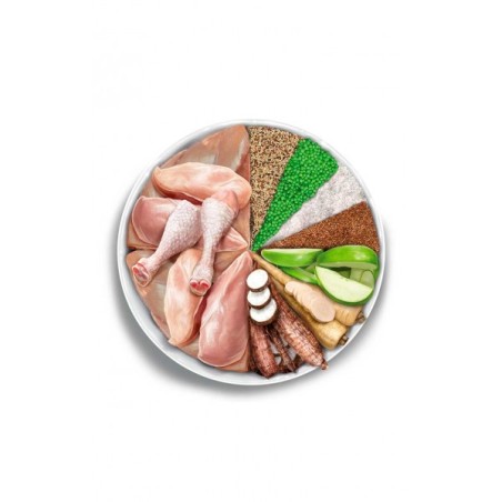 Poulet fraîchement préparé 71 %, pois verts entiers, riz brun, hydrolysat de foie de poulet, levure (Saccharomyces cerevisiae), protéine de pois, tapioca, fibre de pomme, minéraux, huile de poisson (protégée par des tocophérols naturels), huile de poulet (protégée par des tocophérols naturels), psyllium, citrouille déshydratée, krill antarctique, varech, spiruline, quinoa (1 000 mg/kg), carotte blanche (1 000 mg/kg), kale déshydraté, prunes déshydratées (1 000 mg/kg), chicorée (source de FOS – 1 000 mg/kg), paroi cellulaire de levure hydrolysée (source de MOS – 1 000 mg/kg), extrait de mandarine, curcuma (500 mg/kg), Yucca schidigera, romarin.