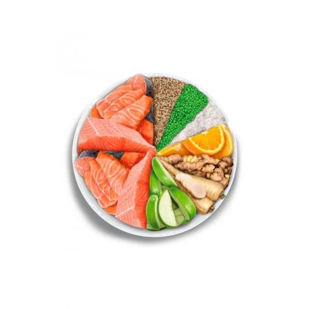 pourcentage exact de saumon frais *68 %, pois verts entiers, protéines de pois, riz brun, protéines de pomme de terre, levure (Saccharomyces cerevisiae), hydrolysat de poisson, minéraux, tapioca, fibre de pomme, huile de poisson (protégée par des tocophérols naturels), psyllium, potiron déshydraté, chou frisé déshydraté, krill antarctique, algue laminaire, spiruline, quinoa (1 000 mg/kg), carotte blanche (1 000 mg/kg), chicorée (source de FOS – 1 000 mg/kg), paroi cellulaire de levure hydrolysée (source de MOS – 1 000 mg/kg), extrait de mandarine, gingembre (500 mg/kg), romarin, Yucca schidigera.