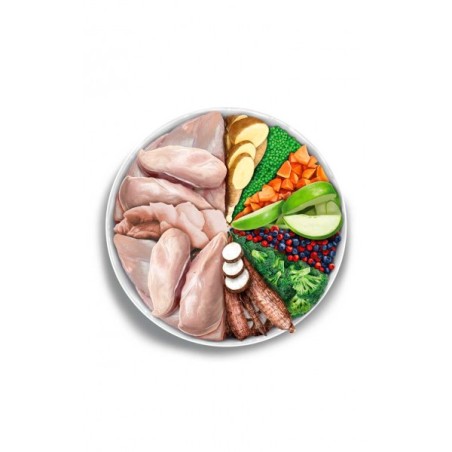 Dinde fraîchement préparée 71 %, pois entiers, pomme de terre déshydratée, protéines de pois, hydrolysat de foie de dinde, levure (Saccharomyces cerevisiae), graines de lin, protéines de pomme de terre, fibre de pomme, minéraux, tapioca, huile de poulet (protégée par des tocophérols naturels), huile de poisson (protégée par des tocophérols naturels), farine de caroube, psyllium, chou frisé déshydraté, krill antarctique, varech, spiruline, chicorée (source de FOS – 1 000 mg/kg), citrouille déshydratée (1 000 mg/kg), brocoli déshydraté (1 000 mg/kg), myrtilles (1 000 mg/kg), canneberges (1 000 mg/kg), paroi cellulaire de levure hydrolysée (source de MOS – 1 000 mg/kg), extrait de mandarine, gingembre, curcuma (500 mg/kg), romarin, Yucca schidigera.