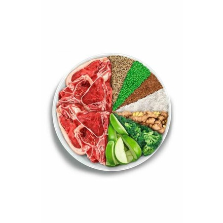 Agneau préparé frais 58% (nous utilisons 100 kg d’agneau préparé frais pour produire 100 kg de notre produit), petits pois entiers, protéines de pomme de terre, protéines de riz, lignocellulose, hydrolysat de foie d’agneau, fibres de pomme, levures (Saccharomyces cerevisiae), riz complet, minéraux, graines de lin, protéines de petits pois, tapioca, huile de poulet (protégée par des tocophérols naturels), poudre de malt d'orge, huile de poisson (protégée par des tocophérols naturels), psyllium, potiron déshydraté, chou kale déshydraté, krill de l’antarctique, algue, spiruline, quinoa (1000 mg/kg), brocoli déshydraté (1000 mg/kg), chicorée (source de FOS – 1000 mg/kg), prunes déshydratées (1000 mg/kg), paroi cellulaire hydrolysée de levures (source de MOS – 1000 mg/kg), extrait de mandarine, gingembre (500 mg/kg), romarin, yucca schidigera.