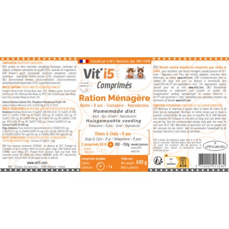 - Comment utiliser Vit’i5 comprimés ? – Donner avec la ration ménagère quotidienne, en respectant le dosage selon la quantité de viande ou poisson.