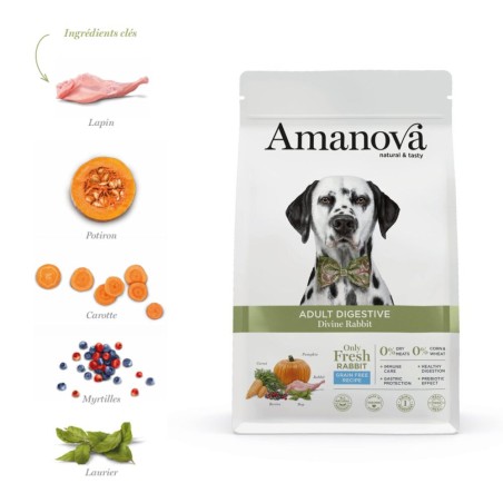 Ces croquettes Amanova au lapin sont spécialement formulées pour les chiens adultes ayant une digestion sensible. Grâce à une base riche en lapin frais, cette recette offre une excellente digestibilité et une assimilation facilitée des nutriments. Sans céréales, elle limite les sources d’irritation digestive tout en apportant une alimentation complète et équilibrée. L’ajout de prébiotiques (FOS), de MOS et de probiotiques contribue à l’équilibre de la flore intestinale. Sa formule naturelle, associée à des ingrédients comme le potiron, les fibres de pomme et le gingembre, aide à soutenir le confort digestif au quotidien.