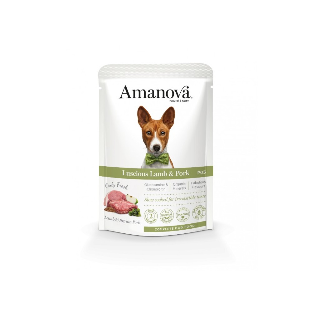 Pâtée chien sans céréales à l’agneau Amanova 100g, riche en viande fraîche et conçue pour les chiens sensibles. Recette mono-protéine à base d’agneau et porc ibérique, sans additifs artificiels. Digestion facilitée, excellente appétence et composition naturelle pour un repas fiable au quotidien.